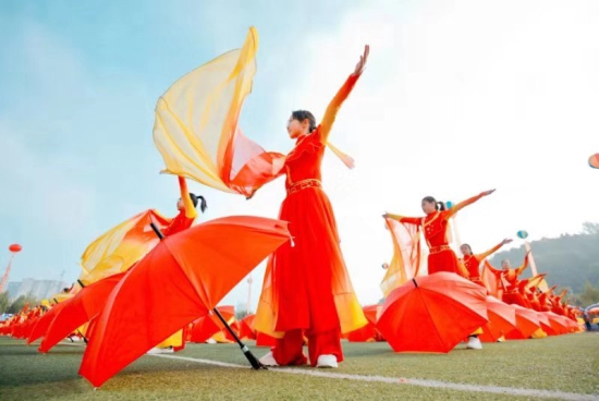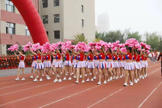 检阅后,七、八年级带来的大型特色团体操表演让人惊艳,绽放的激情,向上的旋律,他们用最完美的表演诠释青春风采。八年级四百个阳光向上的孩子,挥舞着灵动多彩的水袖,红色的伞在他们手中绽放别样光彩,他们用跳动的旋律,圆繁荣之梦——学校繁荣,家乡繁荣,祖国繁荣。舞动青春做崇优学子,放飞梦想展激扬风采。七年级520名新同学手持花环奔向场中央。高举的花环汇聚成一片颜色的海洋,那是热情的色彩,那是希望的色彩,他们用坚实的足音飞扬着校园不朽的礼赞,用崭新的笑容向新中国成立70周年献礼。